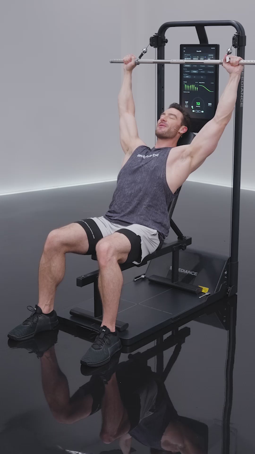 La pantalla de Speediance te guía en cada movimiento con entrenadores reales, conteo de repeticiones, correcciones automáticas y rutinas personalizadas.