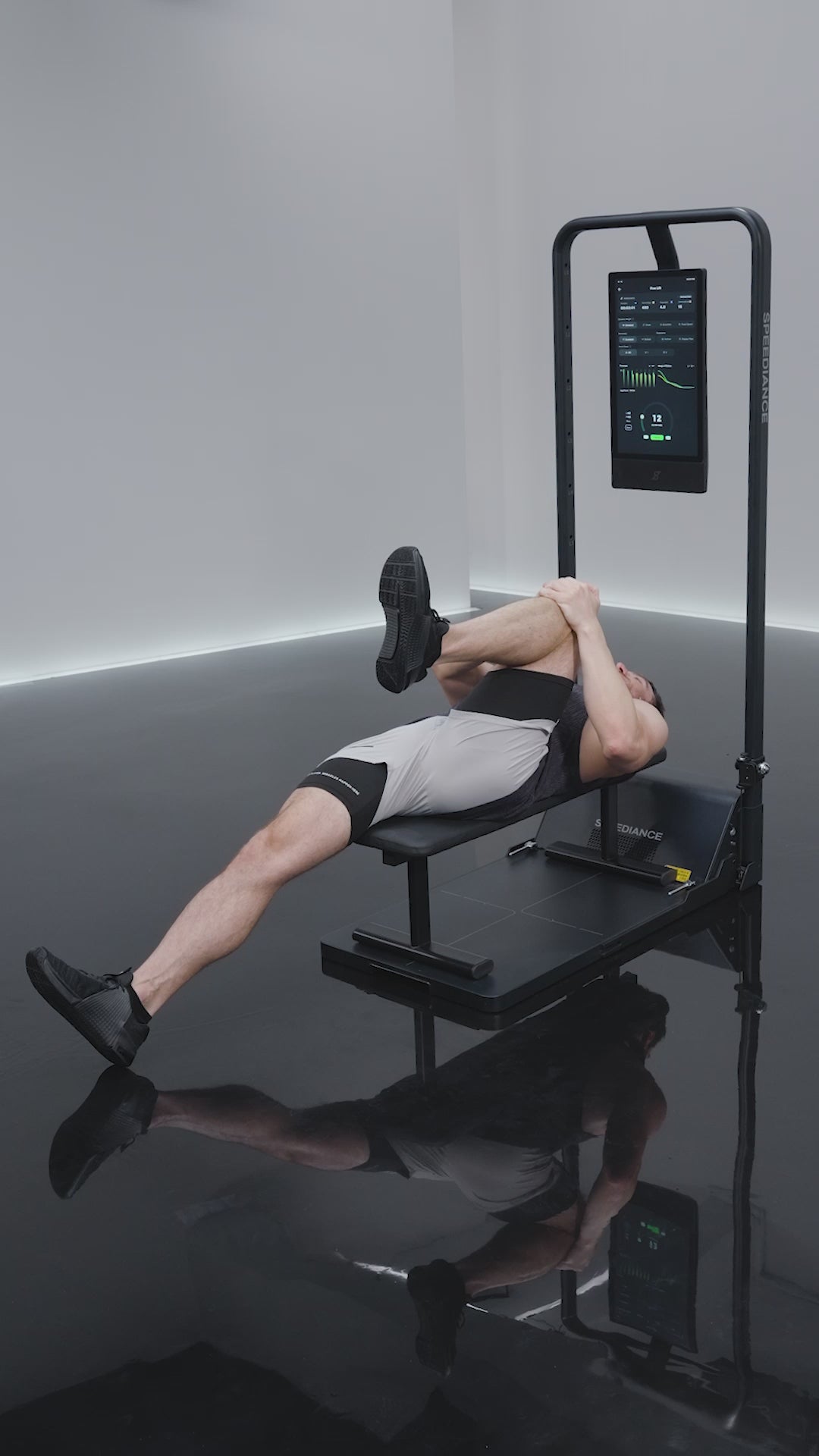 Apoya la parte superior de tu espalda en un banco. Eleva las caderas, formando una línea recta. Extiende una pierna al frente, talón en el suelo. Flexiona la otra pierna y abrázala hacia tu pecho con ambas manos. Mantén la posición para sentir el estiramiento en la cadera. Repite con la otra pierna.