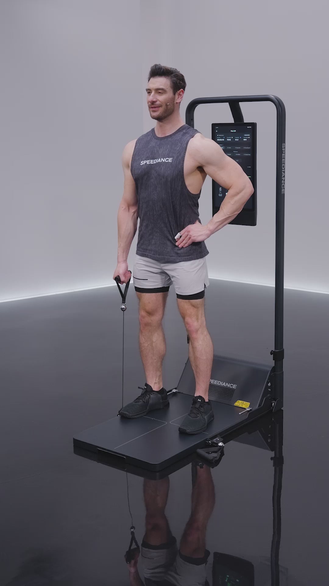 La pantalla de Speediance te guía en cada movimiento con entrenadores reales, conteo de repeticiones, correcciones automáticas y rutinas personalizadas.