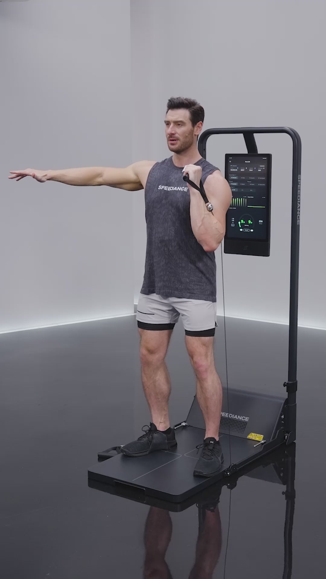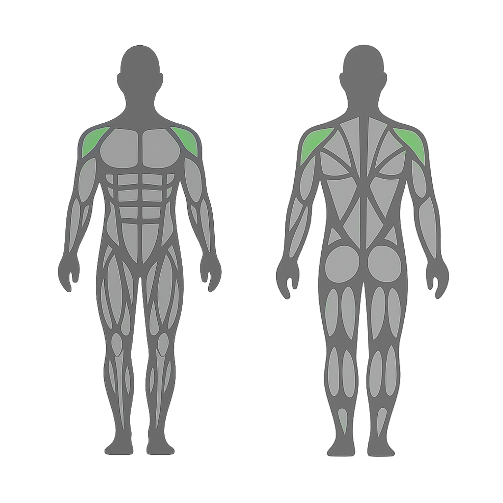 De pie frente a la Gym Monster 2, mango al hombro, pies al ancho de caderas, core firme. Pequeño dip; impulsa con piernas/caderas y empuja diagonal arriba, extiende sin arquear. Controla la bajada. Inspira al bajar, exhala al empujar. Cardio 30–60 s; fuerza 8–12 rep. Alterna lados. Evita lumbar arqueada, giros bruscos y agarre flojo; reduce carga/velocidad si inestable.
