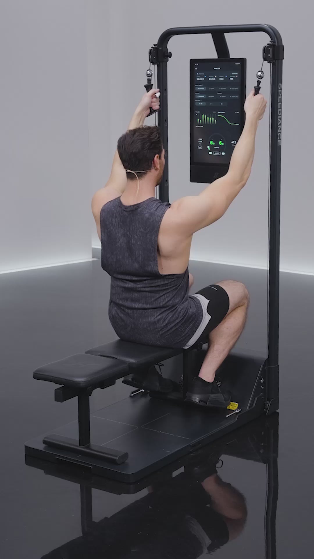La pantalla de Speediance te guía en cada movimiento con entrenadores reales, conteo de repeticiones, correcciones automáticas y rutinas personalizadas.